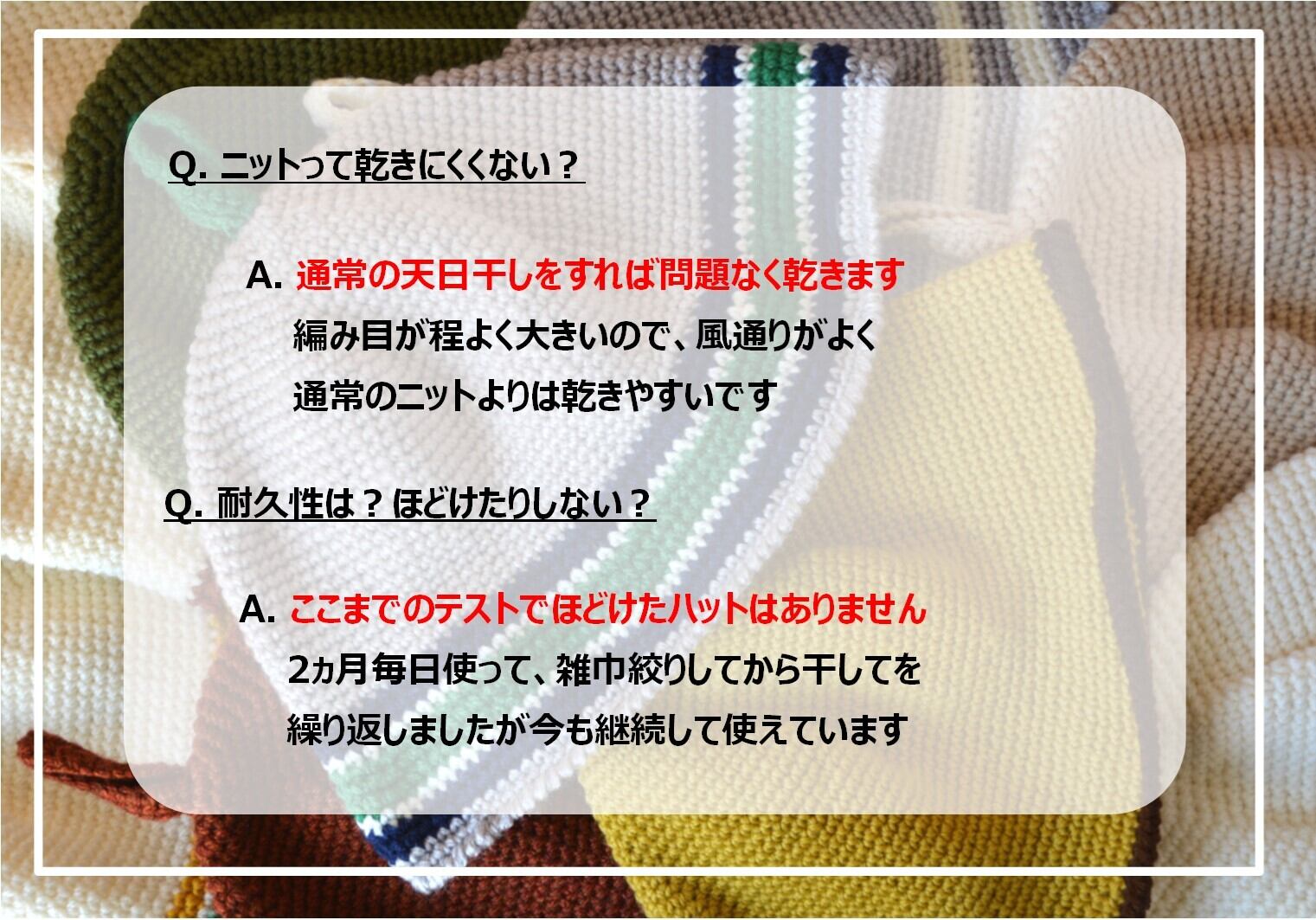 アクリルは密着せずさらっとしていて、かぶりごこち良好です