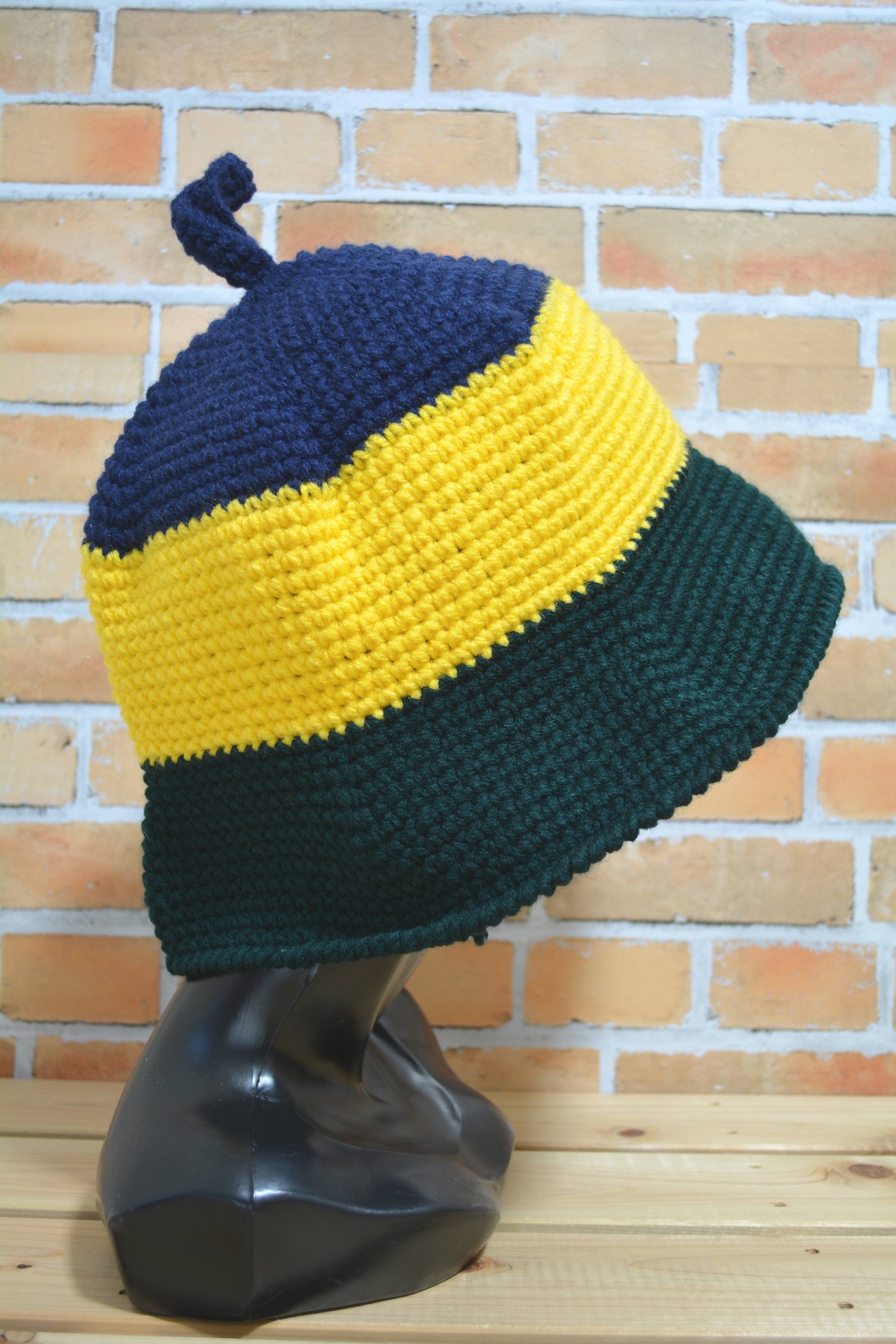 ニットでできたサウナハット トリプル ネイビーxイエローxグリーン ロング