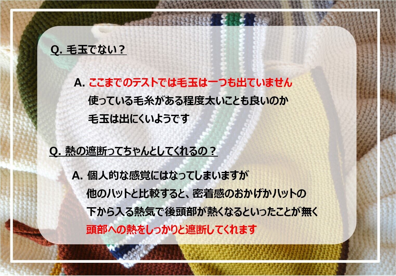 アクリルは密着せずさらっとしていて、かぶりごこち良好です